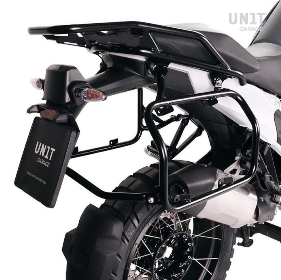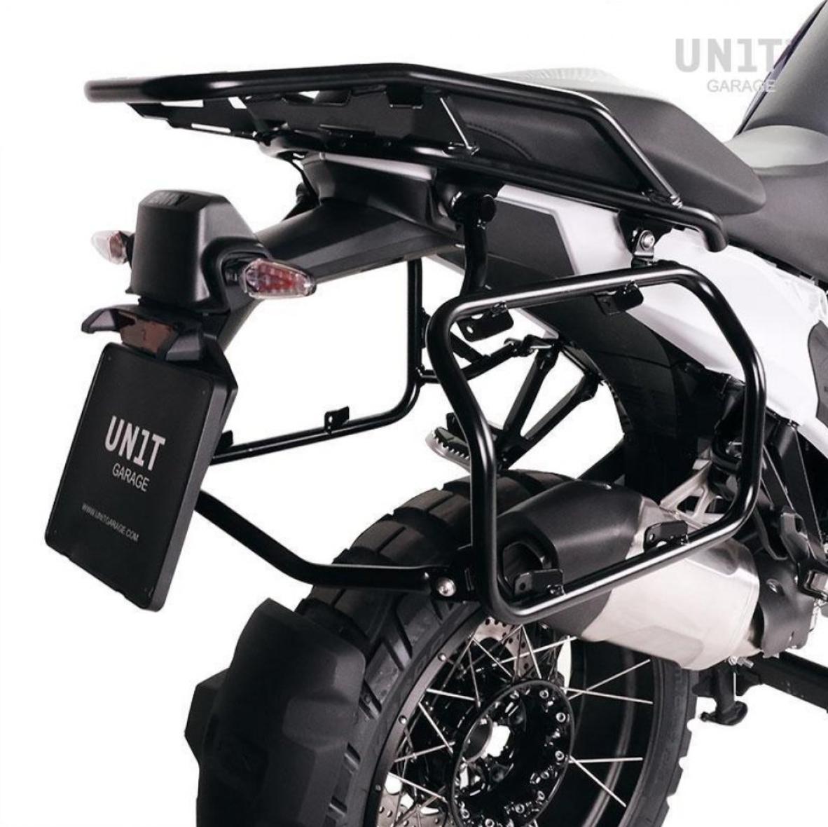 BMW R1300GS アルミナムブラックバックホルダーブラックレザーフロント&サドルバッグサポートフレーム左側キット ユニットガレージ