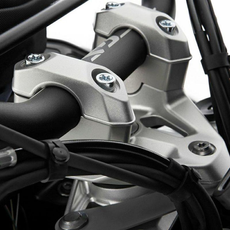 【商品説明】 BMW R1300GS/RT用のハンドルバーライザー。 ・ハンドルバーの高さを約25mm上げます。 ・疲労を感じさせないライディングのためのリラックスしたアップライトな シートポジション ・視認性とコントロール性が向上し、ハンドリングが向上 ・表面の質感とカラーは、アッパーフォークブリッジとクランプにマッチしています。 ・取付キット付属 材質:高強度アルミニウム、精密ダイキャスト、シルバーアルマイト処理 寸法:高さ増加 25 mm ※ライディングアシスタントが装着されている場合、ミラーエクステンションとの併用はできません。