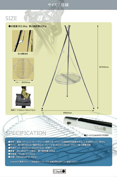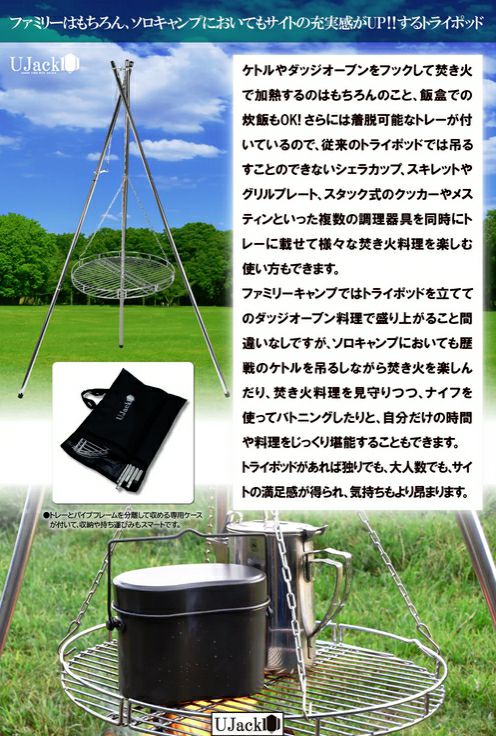 カートに入れる お気に入りに登録する 他の画像を見る 焚火三脚 トライポッド トレー付き UJack (ユージャック) 商品番号 4.58965E+12 販売価格 ¥ 6,800 税込 SALE価格 ¥ 6,800 税込 ダッジオーブン対応 トレー付き 1~3週