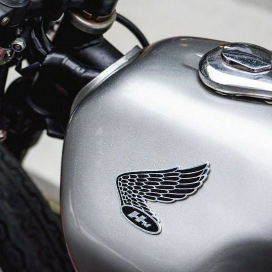 英国のカスタムパーツメーカー"Motone(モートーン)" 製エンブレム。 バイクのタンクやサイドカバーに貼り付け。 ワンポイントアクセントとして、とても優秀なアイテムです。 Motone Honda Wings HM エンブレム Hondaバイク向けにデザインされた、クラシックな「ホンダ ウイング」ロゴをモチーフにしたビレットアルミ製エンブレムです。 燃料タンクやサイドパネルに貼り付けることで、車体のスタイルにレトロなアクセントをプラスできます。 特長 ・CNC切削による高品質なビレット加工:航空用グレードのA6061‑T6アルミから一つひとつ丁寧に切削・研磨されています。 ・装着簡単な両面接着仕様:裏面にはレーザー切断による3M製接着テープを貼付。貼るだけで装着完了、微細な曲面にも追従します。 ・適度なサイズ感:1枚あたり実寸 約85 mm × 85 mm存在感がありつつ違和感のない仕上がり。 ・左右ペアセット:燃料タンクの両側に同時に装着可能な左右セットでの販売です。 ・Hondaの象徴的な「ウイング」ロゴを、アルミ素材で立体的に再現。古き良き時代の雰囲気を愛車に手軽にプラスできます。