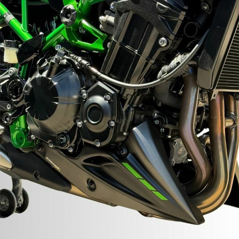 Z900(2025年モデル)に対応するアルマックス製ベリーパンは、エンジン下部を包み込む形状で、車体全体のボリューム感を引き締め、スポーティな印象を演出します。