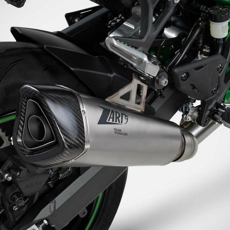 【商品説明】 カワサキ Z900用イタリアの名門ZARD製のハンドメイド、フルエキゾーストマフラー ・本仕様はレーシング仕様です ・4>2>1構成のパイプはAISI 304ステンレススチール製、チタンスリーブおよびカーボンファイバー製エンドキャップ構成です ・本キットはレーシング仕様のみの設定で、サーキット走行専用(公道走行不可)となります 注: ・本フルキット装着後、ユーロ5+(E5 Plus)仕様の車両では、排ガス規制の影響によりECUが触媒異常を検知し、触媒警告灯(情報表示)が点灯する可能性があり、この警告灯を回避するには、ECUの再マッピングが必要です