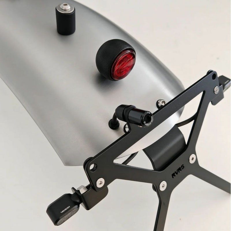Moto Guzzi V7 850用 アルミ製リアフェンダーコンプリートキットです。スタイリッシュなショートフェンダーデザインに、個性的なカリーカラーのリアライトとハイサイダー製ブロンクスLEDウインカーをセットで組み合わせ、車体後方の印象を引き締めながら実用性も確保します。