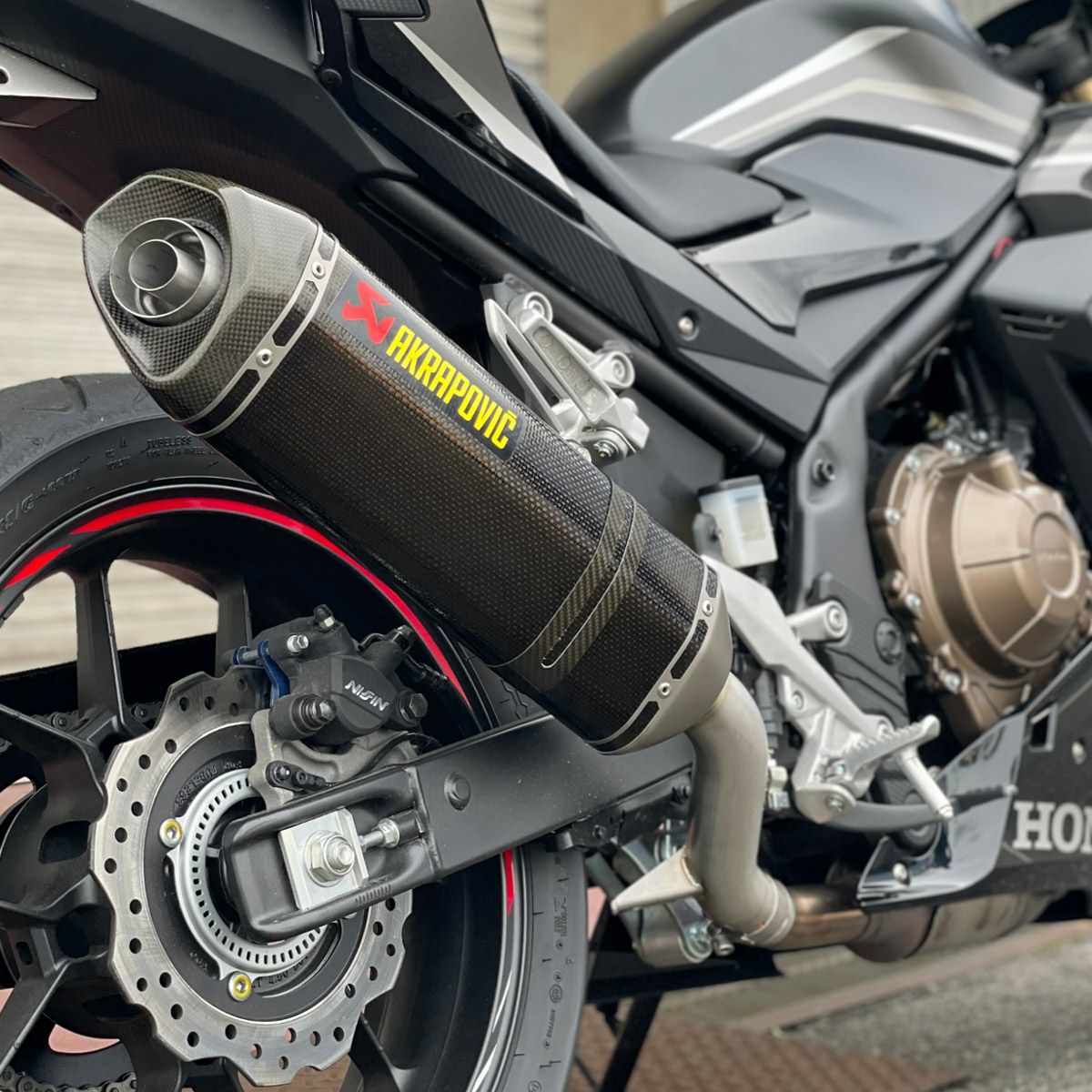 サイレンサーはアクラポビッチらしい、ヘキサゴナルシェイプ。レッドとイエローのロゴが気分を盛り上げます。