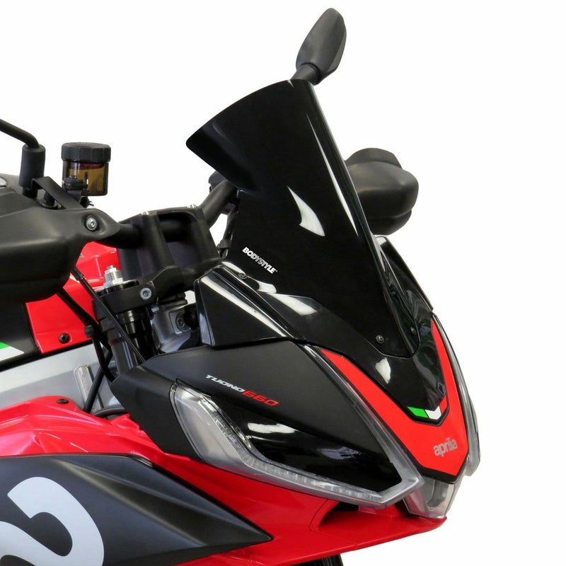 BODYSTYLE製レーシングスクリーン(ダークスモーク)は、愛車のフロントフェイスを精悍に引き締めつつ、走行中の風圧や空気の乱れからライダーを保護するAPRILIA Tuono 660 / Factory (2021-) Tuono V4 / Factory (2021-2024)専用の高品質カスタムパーツです。