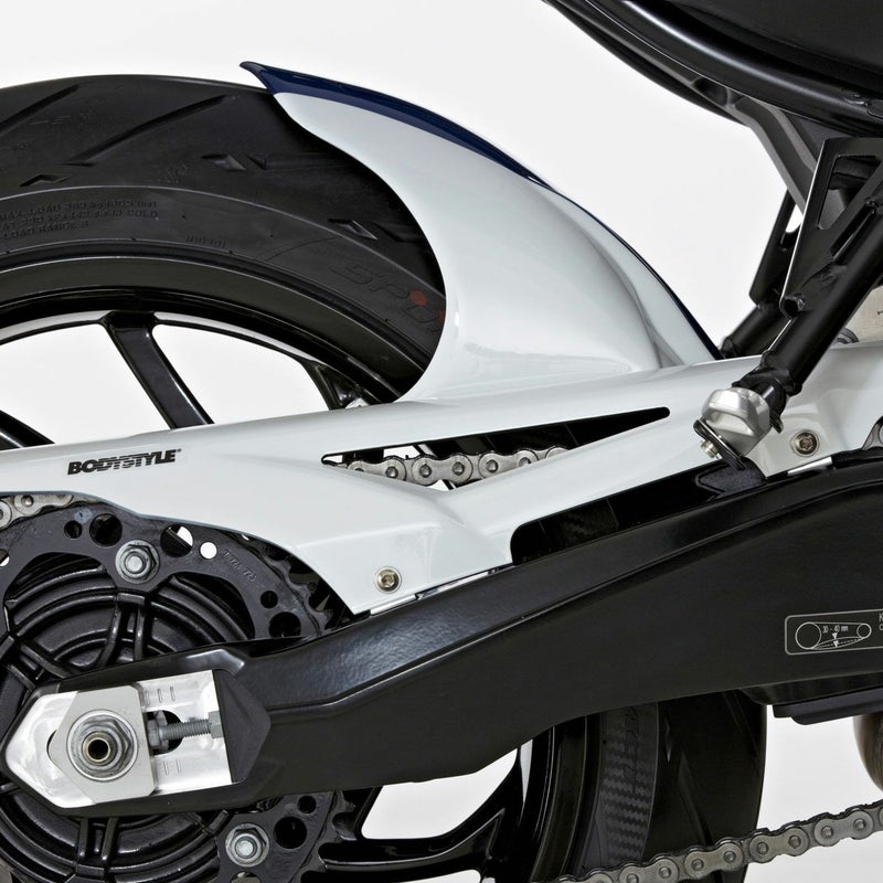 BODYSTYLE製SPORTSLINEリアフェンダー(純正色塗装)は、バイクのリアビューを精悍に引き締めつつ、泥はねや飛び石、雨水、路面の小さな障害物などからリア周辺をしっかり保護するBMW F800R (2009-2014)専用の高品質カスタムパーツです。