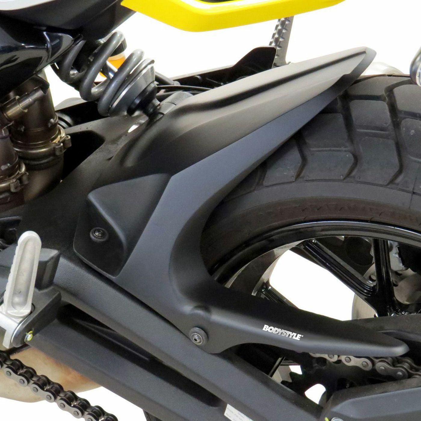 BODYSTYLE製SPORTSLINEリアフェンダー(ブラック塗装)は、バイクのリアビューを精悍に引き締めつつ、泥はねや飛び石、雨水、路面の小さな障害物などからリア周辺をしっかり保護するDUCATI Scrambler Full Throttle / Icon / Nightshift専用の高品質カスタムパーツです。