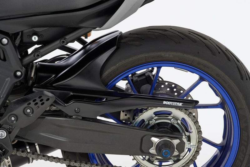 BODYSTYLE製SPORTSLINEリアフェンダー(未塗装)は、バイクのリアビューを精悍に引き締めつつ、泥はねや飛び石、雨水、路面の小さな障害物などからリア周辺をしっかり保護するYAMAHA MT-07 (2018-2024)専用の高品質カスタムパーツです。