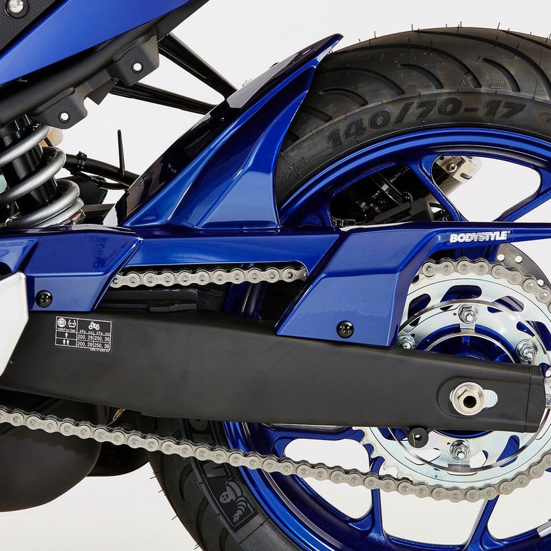 BODYSTYLE製SPORTSLINEリアフェンダー(純正色塗装)は、バイクのリアビューを精悍に引き締めつつ、泥はねや飛び石、雨水、路面の小さな障害物などからリア周辺をしっかり保護するYAMAHA MT-03 (2019)専用の高品質カスタムパーツです。