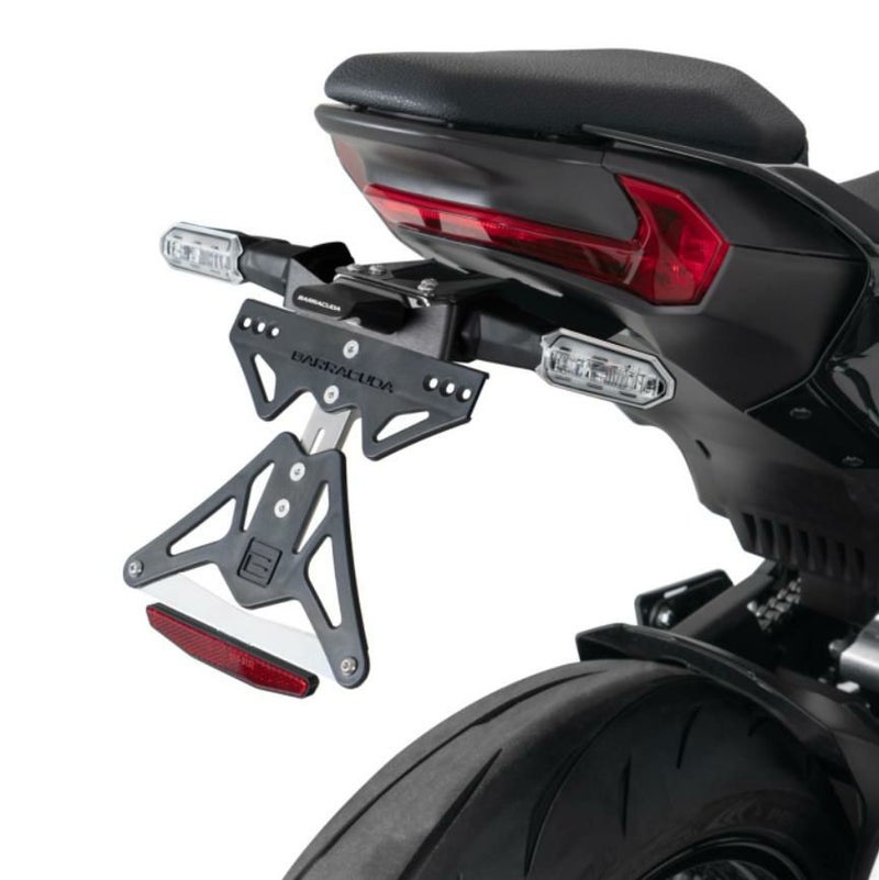 Barracuda(バラクーダ)のカワサキ Z900用ナンバープレートホルダー/フェンダーレスキット ・本キットにはLEDナンバー灯:N1002は含まれていませんので、別途ご購入ください ・リフレクター:NCATも含まれていません。 別途ご購入ください ・本キットは純正ウインカーを使用するデザインになっています ・ナンバープレートホルダーは角度調整が可能です ・ナンバー灯にはコネクター類は含まれませんので取付には別途端子類の準備が必要です ・リフレクターはアルミブラケット付き