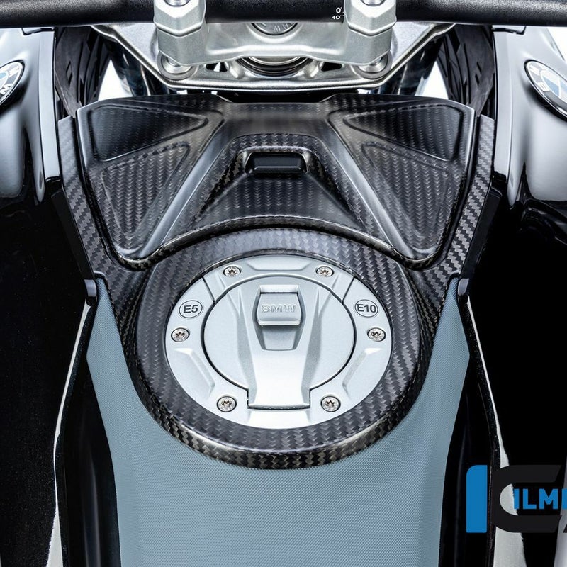 BMW R1300GSに適合する、イルムバーガー製マットカーボン製タンクカバー(2ピースセット)。