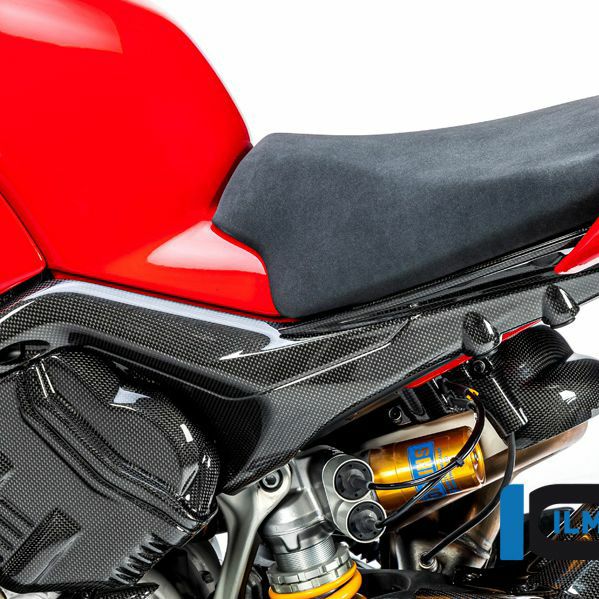 ドゥカティ Streetfighter V4に適合する、イルムバーガー製カーボンリアフレームサイドカバー(左側)は、車体後部フレームを保護しながら、スポーティで高級感のある外観を演出します。