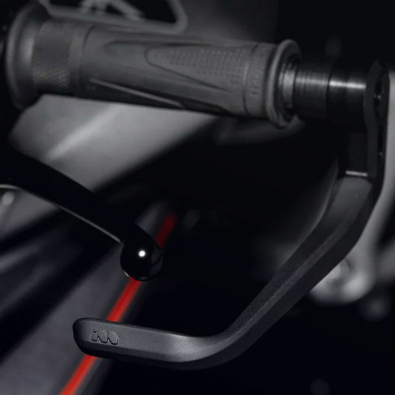Motographe(モトグラフ)製のレバーガードは、CNC加工されたアルミ製エルボーと、成形ABSアームの2パーツ構成。