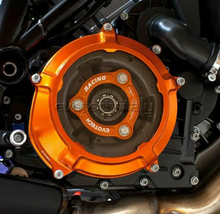 イタリアのパフォーマンスパーツメーカーEVOTECH(エボテック)製スケルトンクラッチカバーとプレッシャープレートのセット商品 プレッシャープレートおよびカバー本体は、CNCアルミ削り出しで、アルマイト処理をおこなっております。 カバーの透明窓は耐熱性のあるプレキシガラス製で、エンジン熱に十分対応しております。 大変インパクトがあるこの商品は、KTM LC8エンジンに適合します。 カラー クラッチカバー オレンジ / プレッシャープレート オレンジ