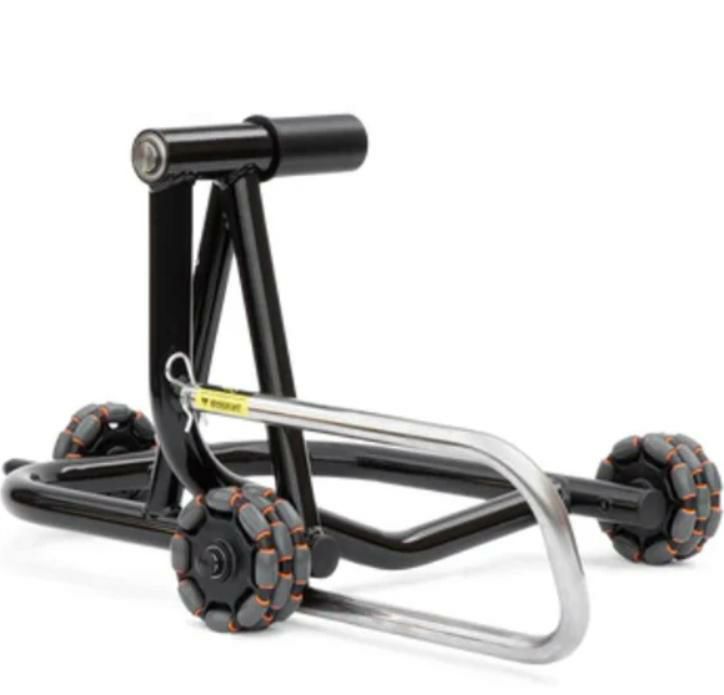 前後左右に自由に動かせる特殊ホイール(オムニホイール)を採用し、バイクを押した方向へスムーズに移動可能。狭いガレージや限られたスペースでも、ストレスなく取り回しができます。