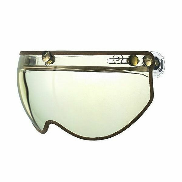 トリム付きハーフシールド。 ●フリップアップ式で開閉が可能です。 ●UV耐性、耐摩耗性、耐傷性に優れたシールド。 ●ほとんどのヘルメットのスナップボタンに装着出来ます。 ●シールドの縁にはブラウンのトリムが装着され、高級感ある仕上がりです。 ●ボタン部分はゴールドカラーの銅を使用し耐久性がありサビにも強くなっています。
