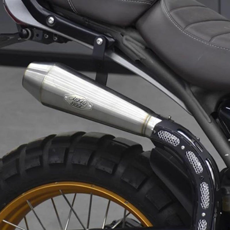・右サイド高位置にエキゾーストを配置し、スイングアーム周りのクリアランスを確保。 地上高を向上し、砂漠スレッド/スクランブラー風の外観を実現。