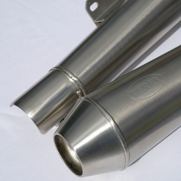 【商品説明】 VEREXのロイヤルエンフェールドインターセプター650/コンチネンタルGT650用スリップオンマフラー リバースコーン・ショートサイレンサータイプ 純正の巨大で重いマフラーを、コンパクトなVEREXリバースコーンマフラーに交換することで、愛車のサウンドとキャラクターを劇的に進化させます。 ・手軽なパフォーマンスアップ: 複雑な加工を必要としないシンプルな交換により、排気の制限を解放。リア周りの重量を5.6kgも削減し、軽快なライディングフィールを実現します。 妥協のない耐久性: 高品質なステンレス鋼を使用し、内部にはニードルマットとステンレスウールを充填。長期間の使用に耐えうる堅牢な設計です。 ・選べるスタイル: 「スタンダード」と、より軽快な「ショート」の2仕様から選択可能。どちらも650ツインのクラシックスタイルに完璧にマッチします。 本仕様はショートです。 ・職人による仕上げ: 一本一本が手作業の溶接(Hand Welded)と手磨き(Hand Polished)で仕上げられ、オーストラリア製ならではの品質を誇ります。 ・多彩なフィニッシュ: ブラッシュ(艶消し)、ポリッシュ(鏡面)、ブラックセラミックの3種類を展開。 ・別売のdBキラーにより音量調節も可能です。 注:上記参考写真中のセラミックブラックは仕上げカラーサンプルです。