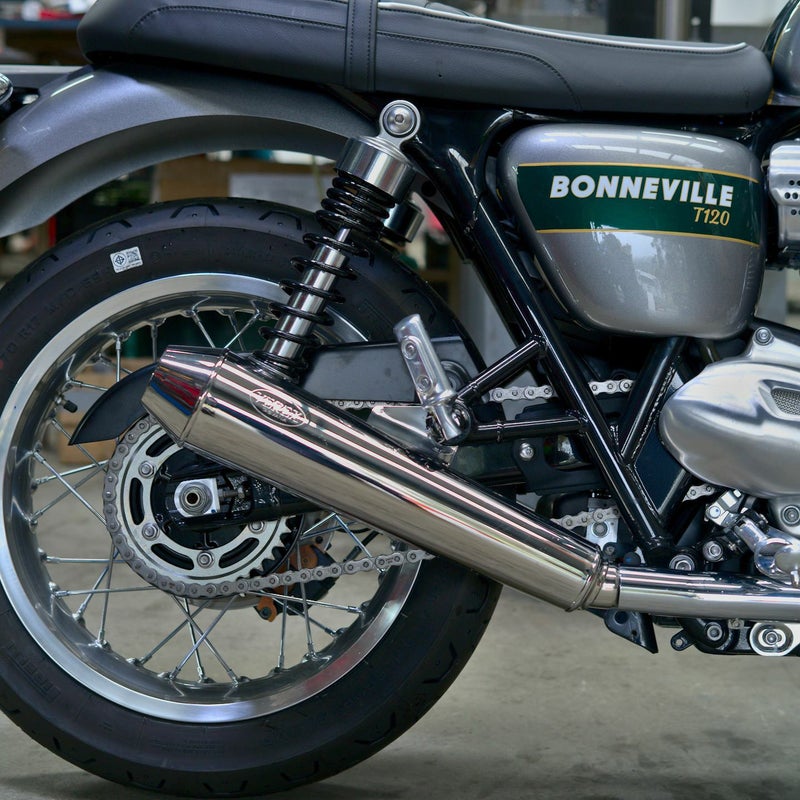 【商品説明】 VEREXのトライアンフ ボンネビルT100/T120用2 IN 2 フルエキゾーストシステム ストレート構造のフルエキゾーストは、キャタライザー(触媒)を排除した完全なパフォーマンス重視の設計となっています。 ・ヘッダーパイプは、1.75インチ(44.45mm)のシングルピース・マンドレル曲げステンレススチールを採用。 ・サイレンサーは、VEREX伝統のリバースコーン・サイレンサー。スタイルに合わせて「スタンダード」または「ショーティー」の2種類から選択可能です。 (サイズ比較は上記製品画像をご参照ください)。 本仕様はスタンダード仕様です。 ・純正O2センサーの取り付け位置を継承し、車体底部にはクロスオーバー・バランスチューブを配置。 仕上げ: ブラッシュド(艶消し)、ポリッシュ(鏡面)、ブラックセラミックコーティングの3種類から選択可能です。 ・別売のdBキラーにより音量調節も可能です。 ・スタンダードサイレンサー仕様では、センタースタンド無し仕様しか存在しません。 注:上記参考写真中のセラミックブラックは仕上げカラーサンプルです。