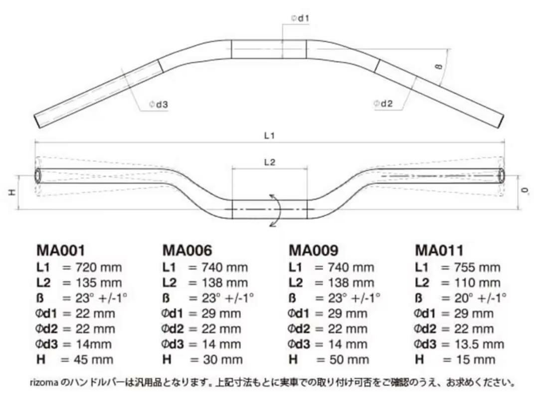 カートに入れる お気に入りに登録する 他の画像を見る rizoma 汎用テーパーハンドルバー Ø 22-29 mm 一文字タイプ MA015B リゾマ 商品番号 MA015B 販売価格 ¥ 19,800 税込 SALE価格 ¥ 19,800 税込 汎用 V7 Stone Ⅲ 19等 2~3週