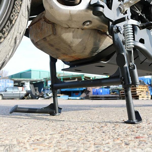 【商品説明】 T-REXレーシングのタイガースポーツ660用アジャスタブルセンタースタンド スチールチューブ製、ブラックパウダーコート仕上げ サイドスタンとは十分なクリアランス、多段階に高さ調整可能です