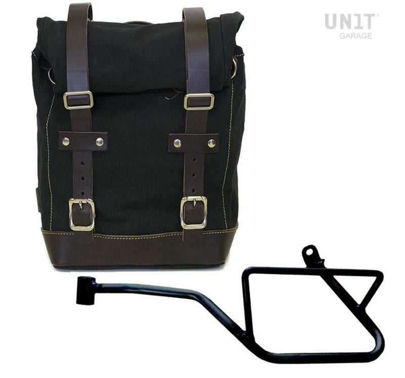 モトグッチV7 850 キャンバスサイドバッグ ブラック/ブラウン&サポート 左側 ユニットガレージ