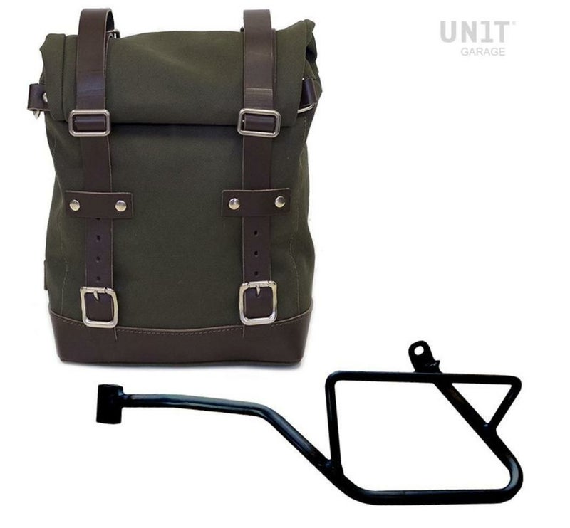 モトグッチV7 850 キャンバスサイドバッグ グリーン/ブラウン&サポート 左側 ユニットガレージ
