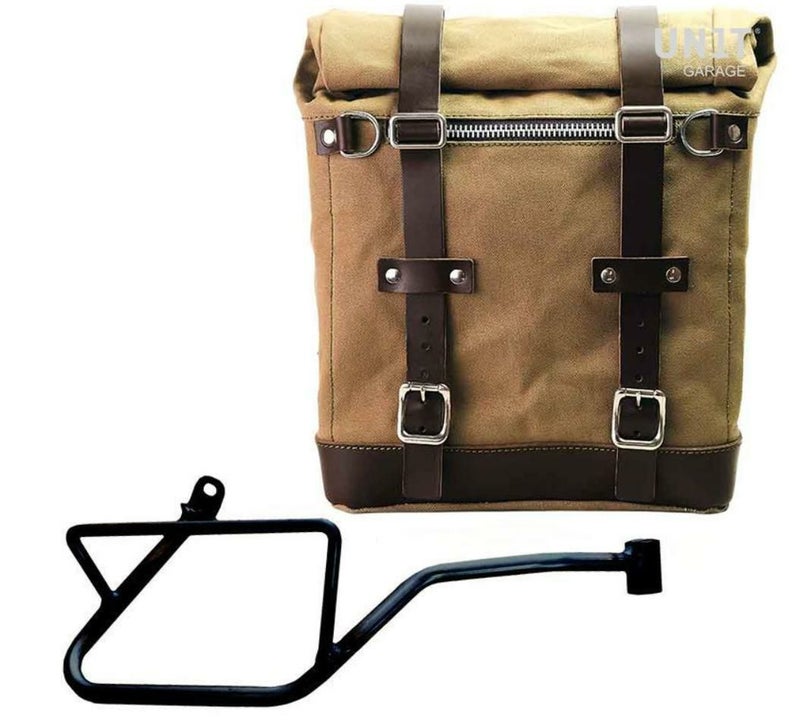 モトグッチV7 850 キャンバスサイドバッグスクラム22-30L ベージュ/ブラウン&サポート 右側 ユニットガレージ