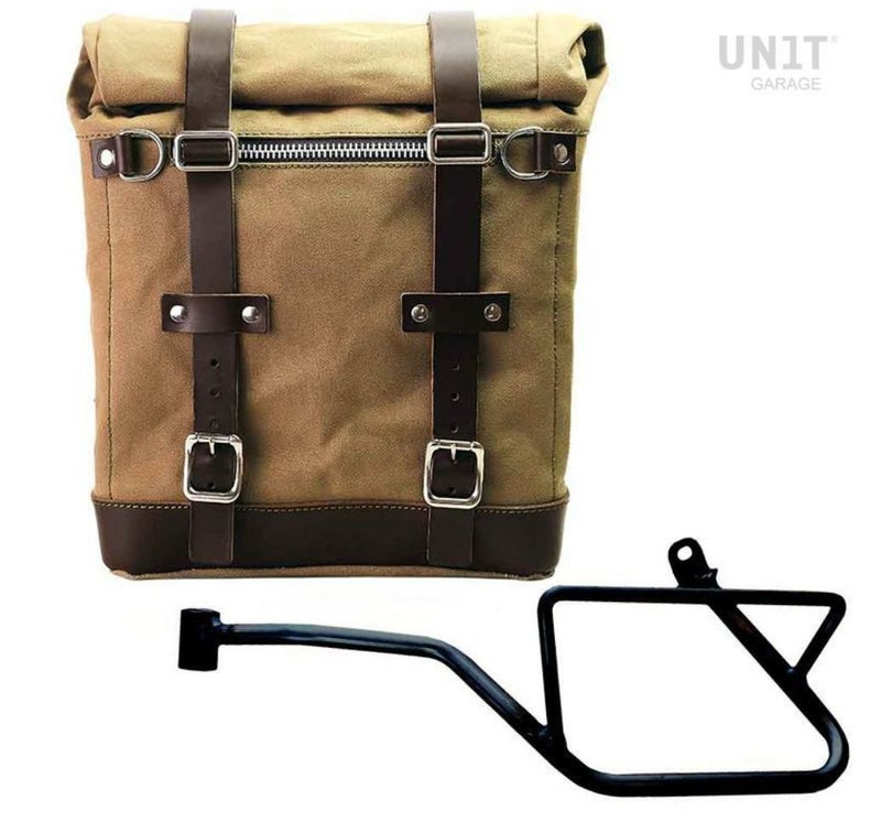 モトグッチV7 850 キャンバスサイドバッグスクラム22-30L ベージュ/ブラウン&サポート 左側 ユニットガレージ