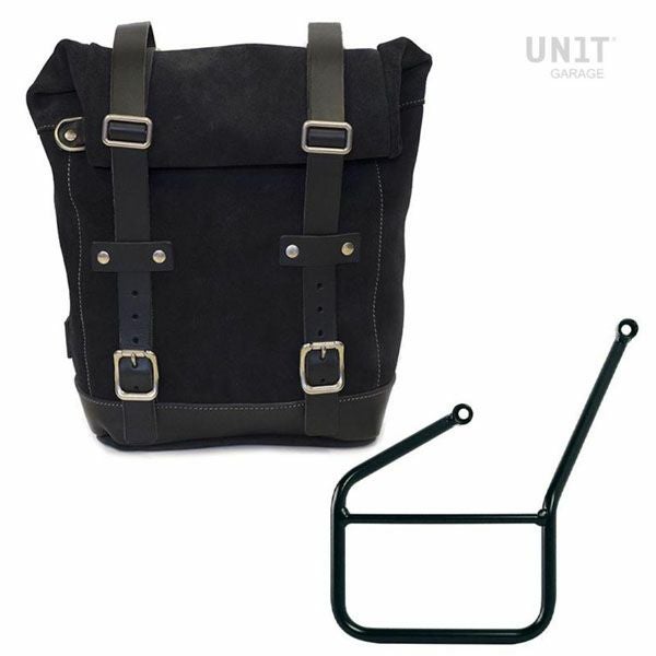 ハスクバーナ ノーデン901/KTM 790-890 アドベンチャー向スプリットレザーサイドバッグ ジェットブラック&サポートフレーム左側キット サドルバックサポートフレームハはスチールパイプ製 マットブラックのエポキシ塗装仕上げ サイドバッグはワックス防水加工したスプリットレザーと3mm厚レザーのトリム構成され、パニア裏面のロッキングシステムで、簡単に脱着できます キーロック付きなので、バイクを離れる際も安心です 開口部はロールアップ式で、2本のバックル付きレザーストラップでしっかりと固定できます 前面にはファスナー仕様の大型ポケット付きです 持ち運び用のハンドル付。 脱着式のショルダーストラップが付属します