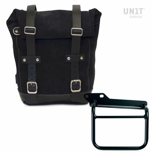 ロイヤルエンフィールド ヒマラヤ/スクラム411 ワックス防水加工スプリットレザーサイドバッグ ジェットブラック &サポート フレーム左側 キット ユニットガレージ