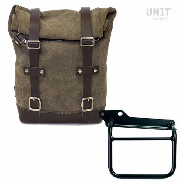 ロイヤルエンフィールド ヒマラヤ/スクラム411 ワックス防水加工スプリットレザーサイドバッグ モスグレイ &サポート フレーム左側 キット ユニットガレージ