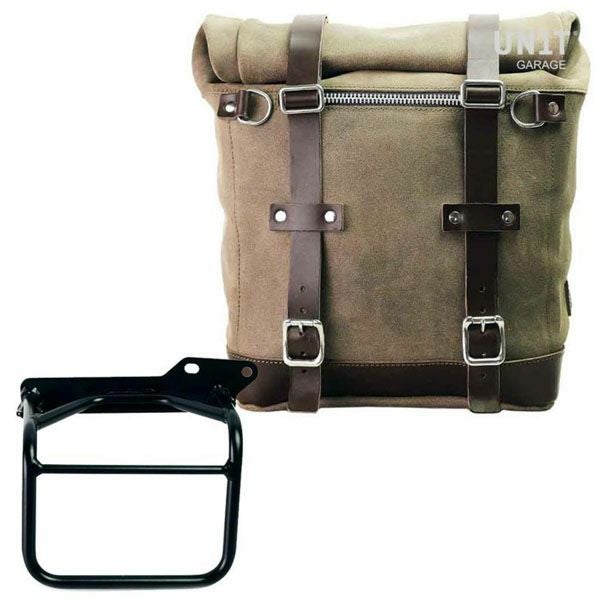 ロイヤルエンフィールド ヒマラヤ/スクラム411 ワックス防水加工スプリットレザーサイドバッグ スクラム22-30L モスグレイ &サポート フレーム右側 キット ユニットガレージ