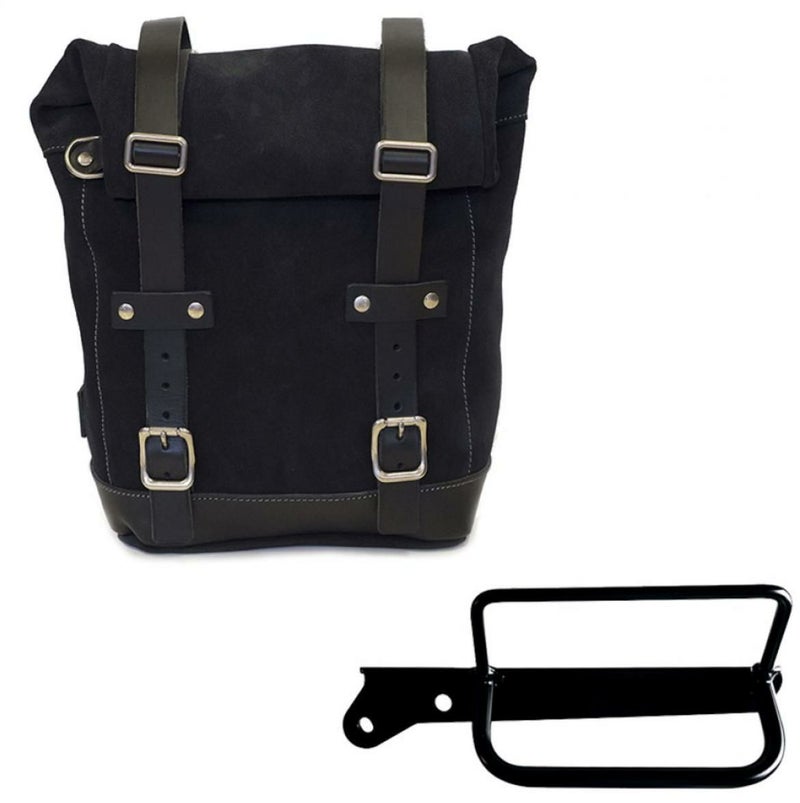 ロイヤルエンフィールド クラシック350/メテオ350/スーパーメテオ650/クラシック650/ショットガン650 ワックス防水加工スプリットレザーサイドバッグ 10L-14L ジェットブラック &サポート フレームキット ユニットガレージ