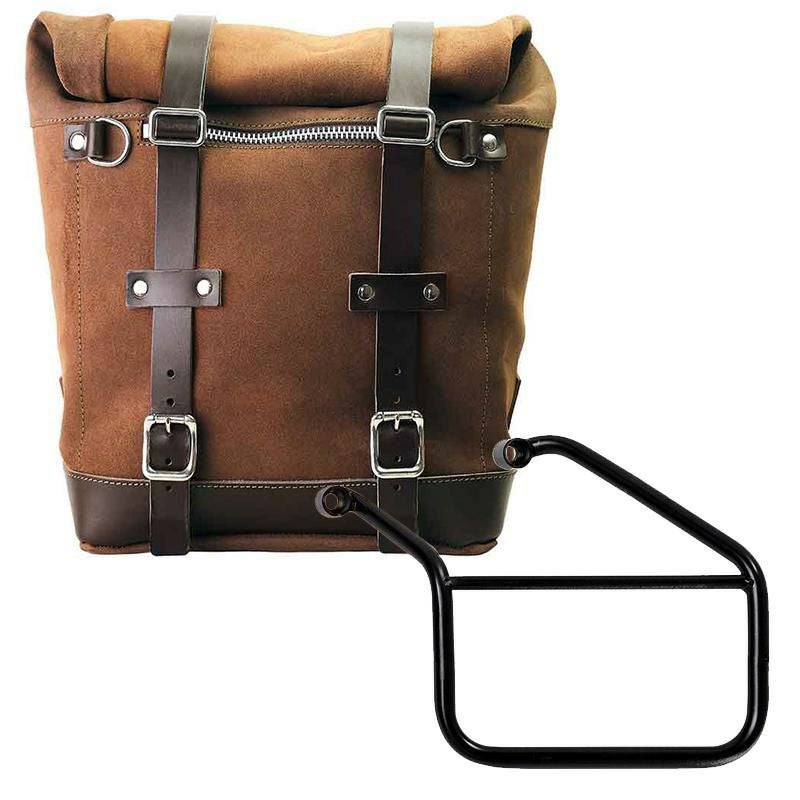 トライアンフ トライデント660専用、UNIT GARAGEのワックス防水加工スエードレザー製サイドバッグと左側サポートフレームのセットです。