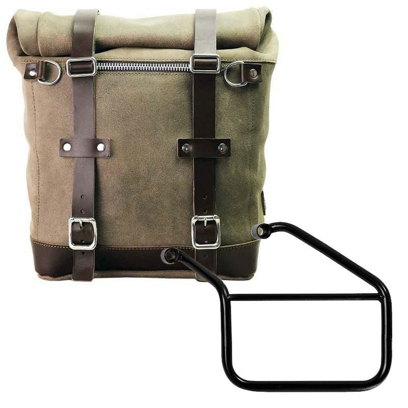 トライアンフ トライデント660専用、UNIT GARAGEのワックス防水加工スエードレザー製サイドバッグと左側サポートフレームのセットです。
