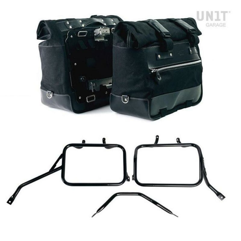 トライアンフ スピード400/スクランブラー400X用ワックスコットン製キャンバス地のカルトサイドパニアバッグブラック+ステンレス製クイックリリースシステム&ロック付きアルミバックプレー+アトラスアルミニウムパニア用サイドフレームの左右セット