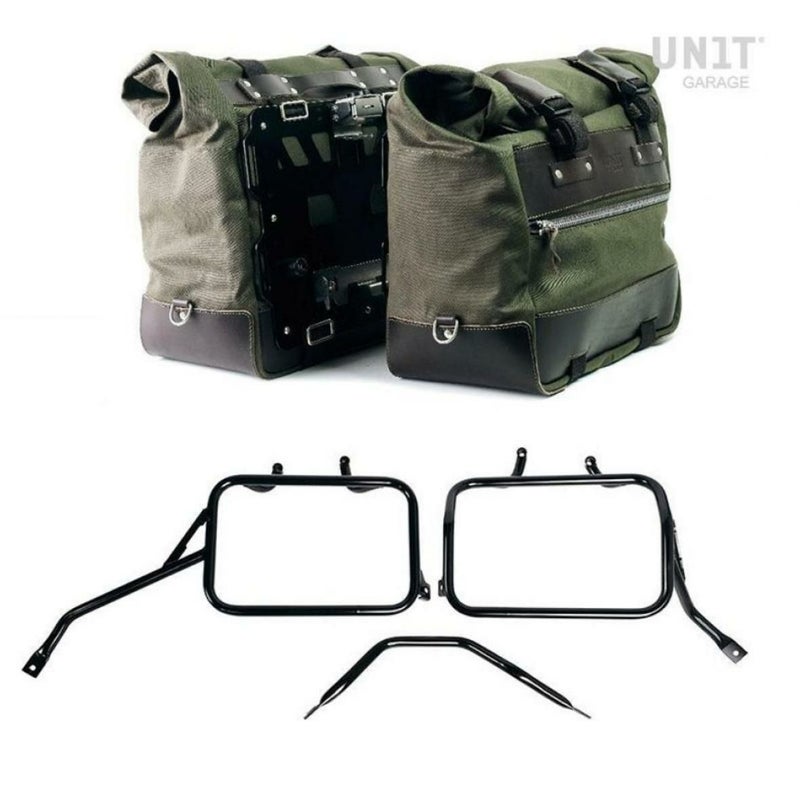トライアンフ スピード400/スクランブラー400X用ワックスコットン製キャンバス地のカルトサイドパニアバッググリーン+ステンレス製クイックリリースシステム&ロック付きアルミバックプレー+アトラスアルミニウムパニア用サイドフレームの左右セット