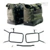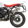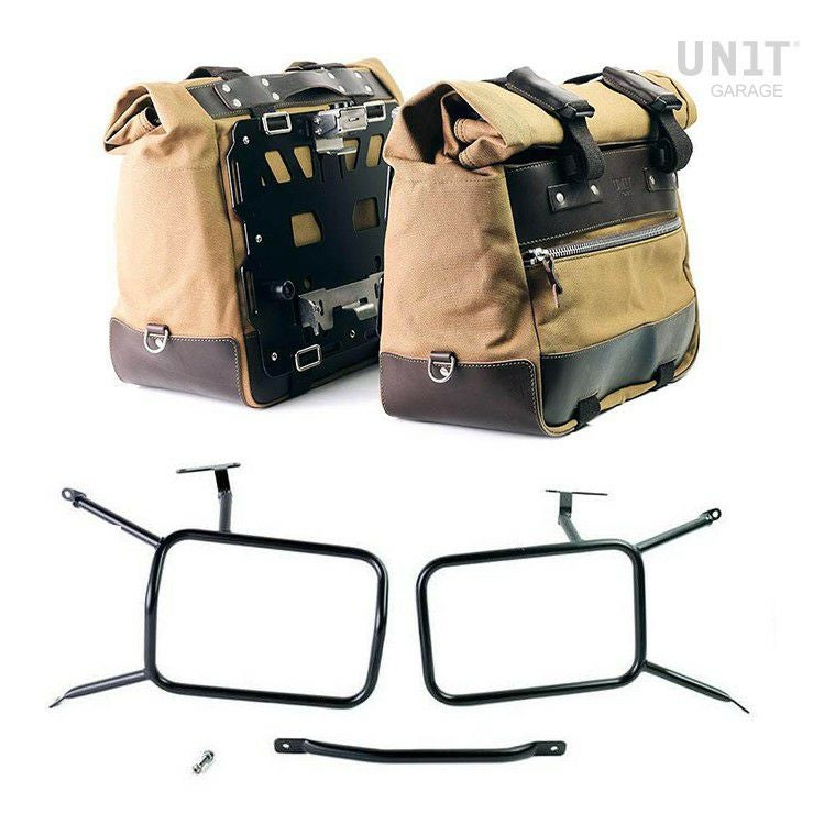 BMW RnineT用、アルミニウム製バックプレート付き ワックスドスエード製カルトサイドパニア+ステンレス製クイックリリースシステムとロック+アトラスアルミニウムパニア用サブフレームの左右セット。