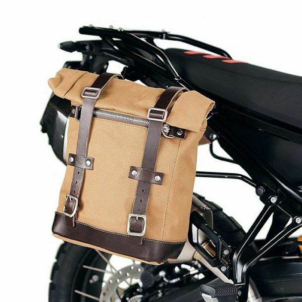 BMW F900GS用、UNIT GARAGEのキャンバス製サイドバッグ 10-14L + 右側サイドバッグサポートのセット。