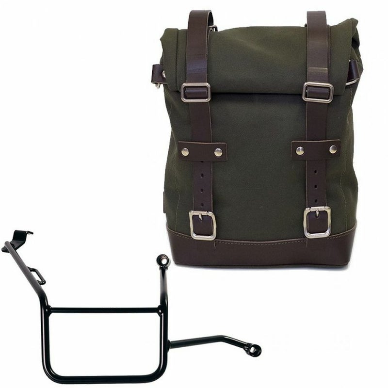 BMW F900GS用、UNIT GARAGEのキャンバス製サイドバッグ 10-14L + 右側サイドバッグサポートのセット。