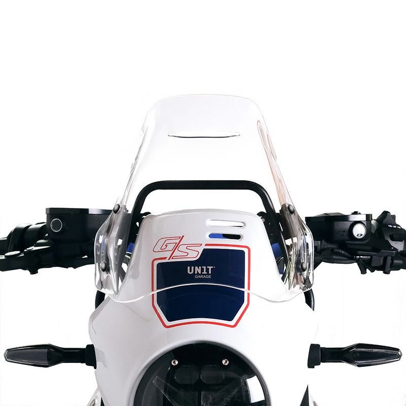 BMW R12 G/S用 ユニットガレージ製 アジャスタブルスクリーン。 最小限の保護とデザイン。柔軟かつ耐久性に優れた素材で作られており、バイクの見た目を損なうことなく優れた空力保護を提供します。 このエクステンションは、G/Sのミニマルなスタイルを維持しつつ、長距離走行時の快適性を確保するよう設計されています。 高さ調整可能で、オフロード使用時でも視界不良などの不快感を与えず、あらゆる快適に走行可能。