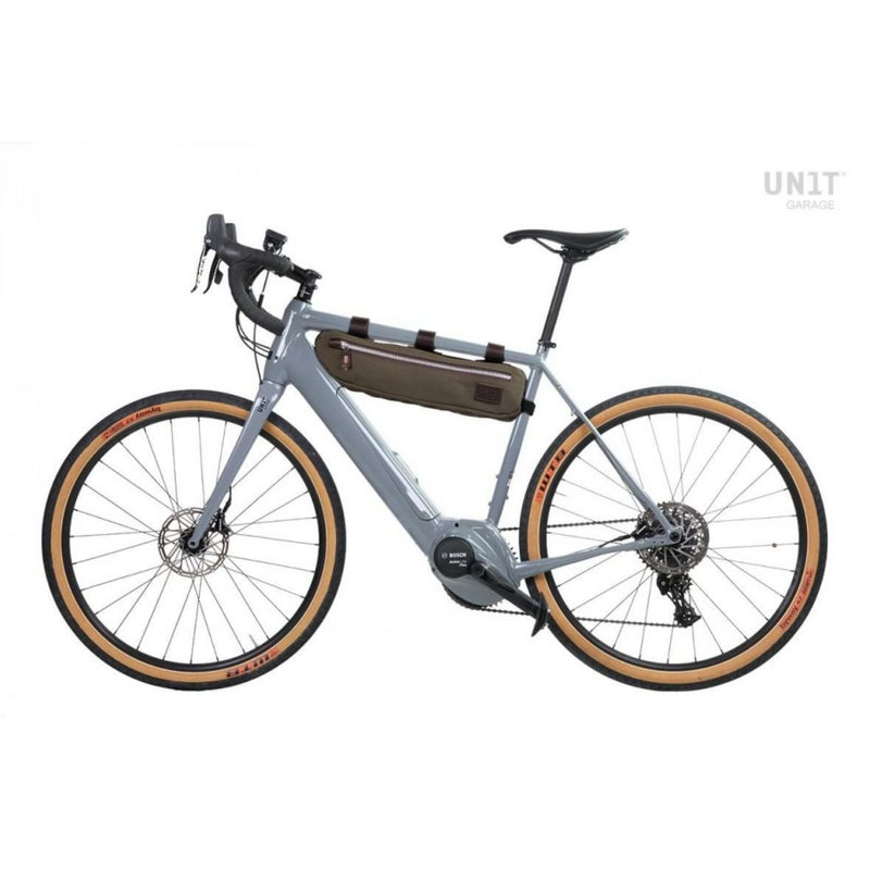 【商品説明】 ユニットガレージのサイクルパーツ イタリア製ハンドメイドのフレームパック/フレームンバッグ ・最高品質の防水ワックスキャンバスに3mmのレザートリムとナチュラルスレッドによるステッチが特徴です ・フレームパックの外周にはPALSスタイルのレザーループがあり、強力で高い粘着性を持つベルクロストラップを使ってトップチューブやシートチューブに簡単に装着できます ・中央部に十分な収納スペースがあり、低重心設計によって安定した走行を実現します ・ベルクロストラップは軽量で取り付け位置の調整が容易で、さまざまなフレーム形状や直径に対応します。 ・キットには、トップチューブ用レザートリム付きベルクロストラップ ×3本及びシートチューブ用ダブルベルクロストラップ ×2本が含まれます *製品は改良のため、仕様や画像が予告なく変更される場合があります