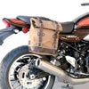 【商品説明】 カワサキ Z900RS、Z650RS用 右側サドルバッグレールとクイックリリース式キャンバスパニアのセットです。 サドルバッグレールはスチールパイプ製。マットブラックのエポキシ塗装仕上げ。 パニアはクラシカルなワックスコットンキャンバス地。 厚さ3mmの丈夫なレザートリム付き。 パニア裏面のロッキングシステムで、簡単に脱着できます。 キーロック付きなので、バイクを離れる際も安心です。 開口部はロールアップ式で、2本のバックル付きレザーストラップでしっかりと固定できます。 前面にはファスナー仕様の大型ポケット付きです。 持ち運び用のハンドル付。 脱着式のショルダーストラップが付属します。