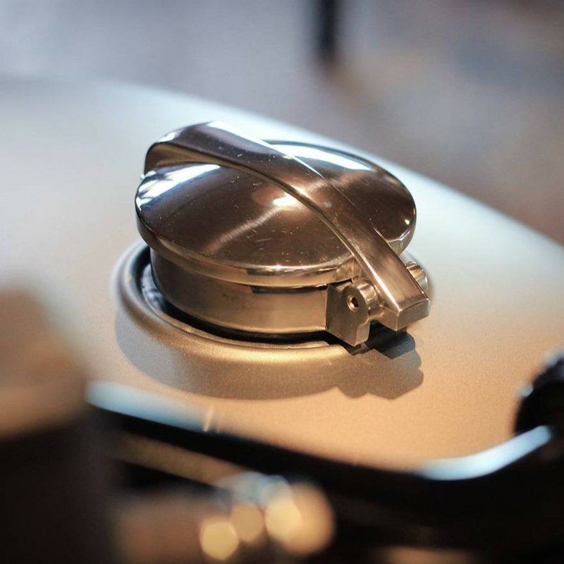 アダプター付きフルキットで、取り付けに加工は不要。キャップ、シール、取り付けハードウェア、アダプターがセットになっており、既存の燃料給油口にポン付けで交換できます。スムーズなワンタッチ開閉(ロック機構なし、押ボタン式オープン)で、クラシカルかつ上質なアルミ仕上により車体の雰囲気を崩さずドレスアップを実現。