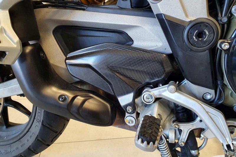 【商品説明】 マルチストラーダV4用カーボンヒールガード 純正と交換するだけで取り付けられます マットブラック、グロスブラックから選べます 注:上記車両装着写真はグロスブラックです