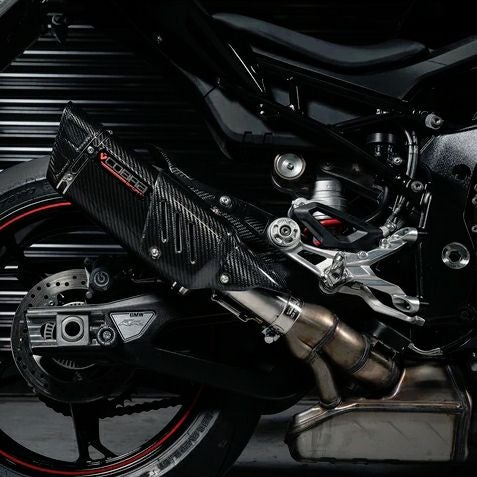 カーボンヒートシールド付きのコブラスポーツのトライオーバルカーボンファイバーサイレンサー。