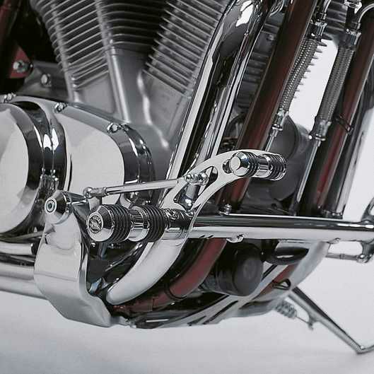高光沢クロームメッキ仕上げのスチール製で、ライダーのフットポジションを約27cm前方へ移動させる設計がされ、乗り心地と見た目双方の強化を実現。