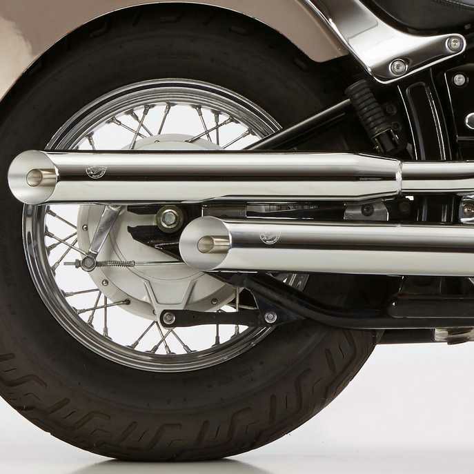 美しい鏡面仕上げと滑らかなスラッシュカットスタイルがクラシックバイクに洗練されたカスタムルックを与えます。