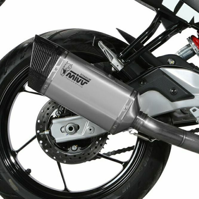 イタリアのマフラーブランドMIVVのチタン製のフルシステムマフラー。 サイレンサーモデル:SR-1 SR-1は主にスーパーバイクやハイパーネイキッドに向けて開発がされたサイレンサーモデル。 MotoGP - Moto2 - Moto3の世界選手権で得たノウハウを最大限に生かし、最新の注意を払って製造が行われています。 純正に比べ2kg以上の軽量化に成功しているだけではなく、トルク、パワー共に純正品よりも高い数値を実現しています。 適合車種: アプリリア RS457 (2024-)